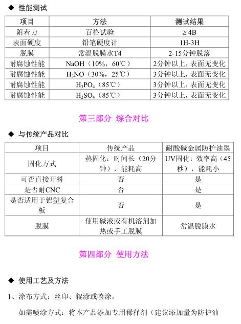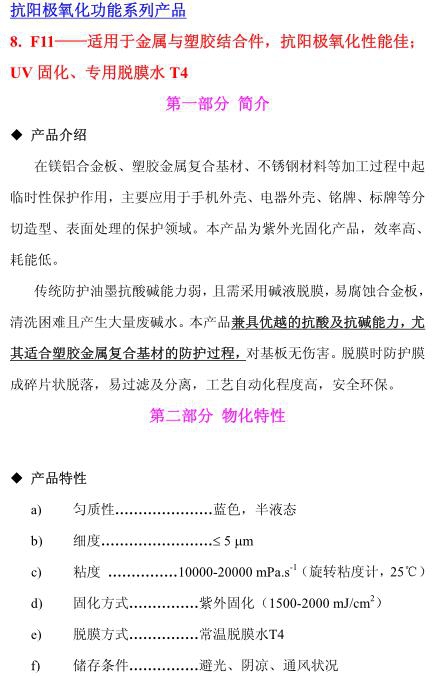 F11——適用于金屬與塑膠結(jié)合件,抗陽極氧化性能佳;UV 固化、專用脫膜水T4