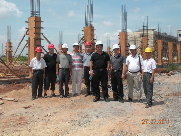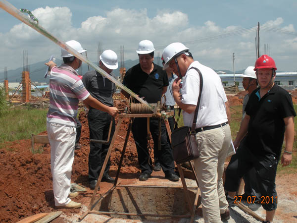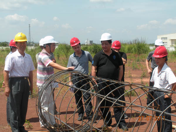 胡美龍一行在南雄市招商辦、南雄精細化工基地管理處相關同志以及我公司派駐基地項目經理的陪同下,首先對建設工地現場進行了詳細深入的檢查和了解。工地現場目前已完成生產基地綜合樓、甲乙類生產車間以及相關配套設施的大部分挖孔樁的混凝土澆筑,乙類車間已開始基礎上面的建筑施工。胡美龍要求在保證安全的前提下盡快完成剩余10條超深挖孔樁的施工,并對現場的鋼筋籠制作不符合設計和質量要求的重要環節提出了整改要求。