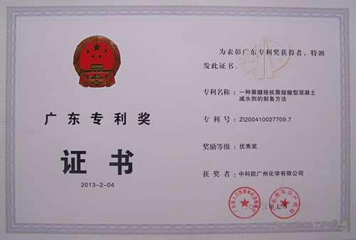 7月23??日上午,在廣東省知識產權工作座談會暨廣東省專利獎勵大會上, 廣州化學發明專利“一種聚醚接枝聚羧酸型混凝土減水劑的制備方法”(專利號ZL200410027709.7)獲2013年廣東專利優秀獎。