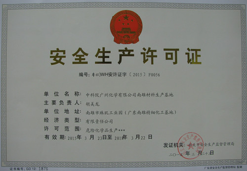 2015年3月23日,韶關(guān)市安全生產(chǎn)監(jiān)督管理局向中科院廣州化學(xué)有限公司南雄材料生產(chǎn)基地核發(fā)了危險化學(xué)品安全生產(chǎn)許可證。