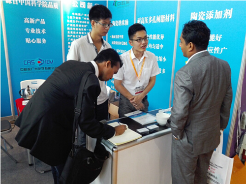 展會中廣州化學(xué)三種產(chǎn)品:陶瓷系列添加劑、耐高壓多孔樹脂材料和新型陶瓷納米釉,以其優(yōu)異的性能特點吸引了大量國內(nèi)外參展商和買家駐足了解,并與廣州化學(xué)參展人員探討交流合作。