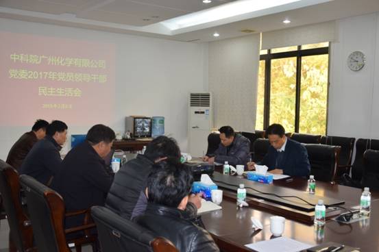 2月8日,中科院廣州化學有限公司(廣州化學)黨委召開2017年度黨員領導干部民主生活會。會議由廣州化學黨委書記胡美龍主持,黨員領導班子成員參加,非黨員領導班子成員列席。中科院廣州分院副院長、分黨組成員魏平,監察審計處處長彭斌到會督導。