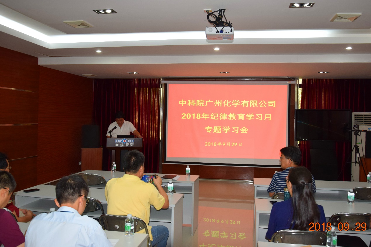 9月29日,中科院廣州化學(xué)有限公司(廣州化學(xué))開(kāi)展2018年紀(jì)律教育月專(zhuān)題學(xué)習(xí)活動(dòng)。廣州化學(xué)中層及以上領(lǐng)導(dǎo)干部、黨委委員、紀(jì)委委員、全資及控股公司領(lǐng)導(dǎo)班子成員、在職黨支部書(shū)記、在職支部紀(jì)檢委員、團(tuán)委書(shū)記共40多人參加會(huì)議。會(huì)議由公司黨委書(shū)記、董事長(zhǎng)胡美龍主持。