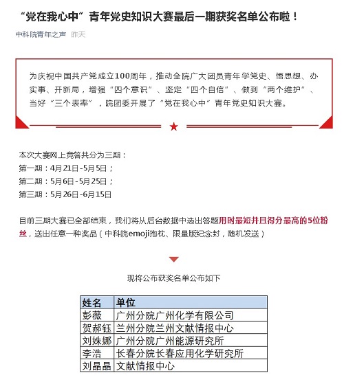 6月15日,中國科學院(中科院)團委公布了“黨在我心中”青年黨史知識大賽第三期(5月26日-6月15日)獲獎名單,中科院廣州化學有限公司(廣州化學)團員彭薇在比賽中脫穎而出,憑借答題用時最短并且得分最高取得優異成績。